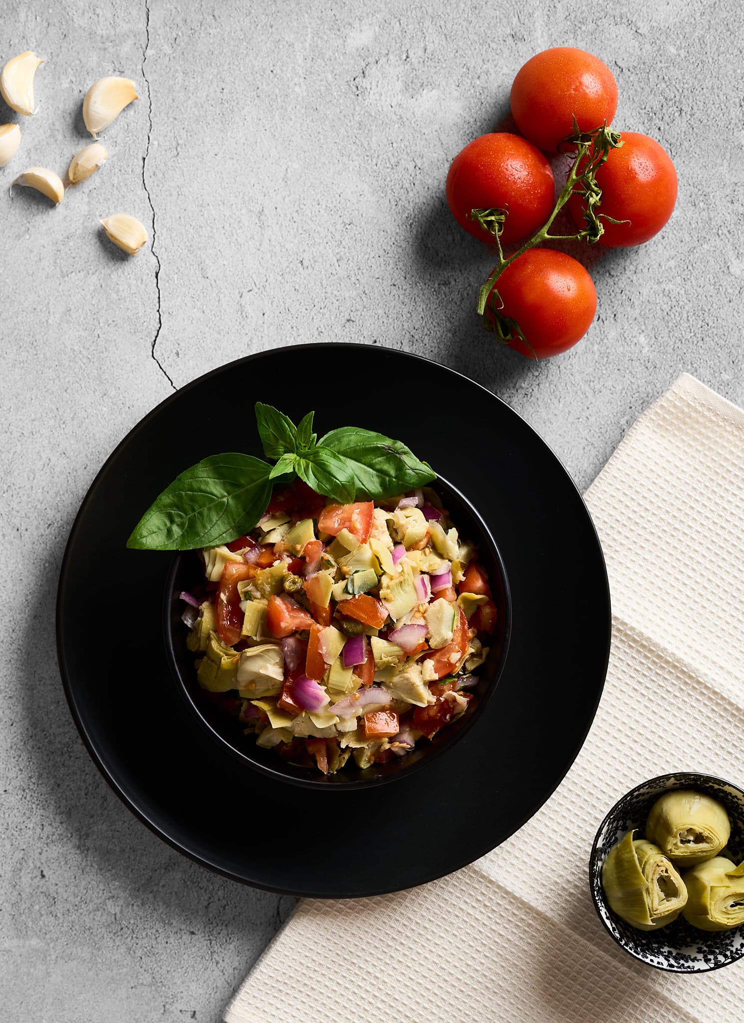 Step 2- Finely dice the red onion and basil leaves and mince the garlic and add it to the tomatoes.