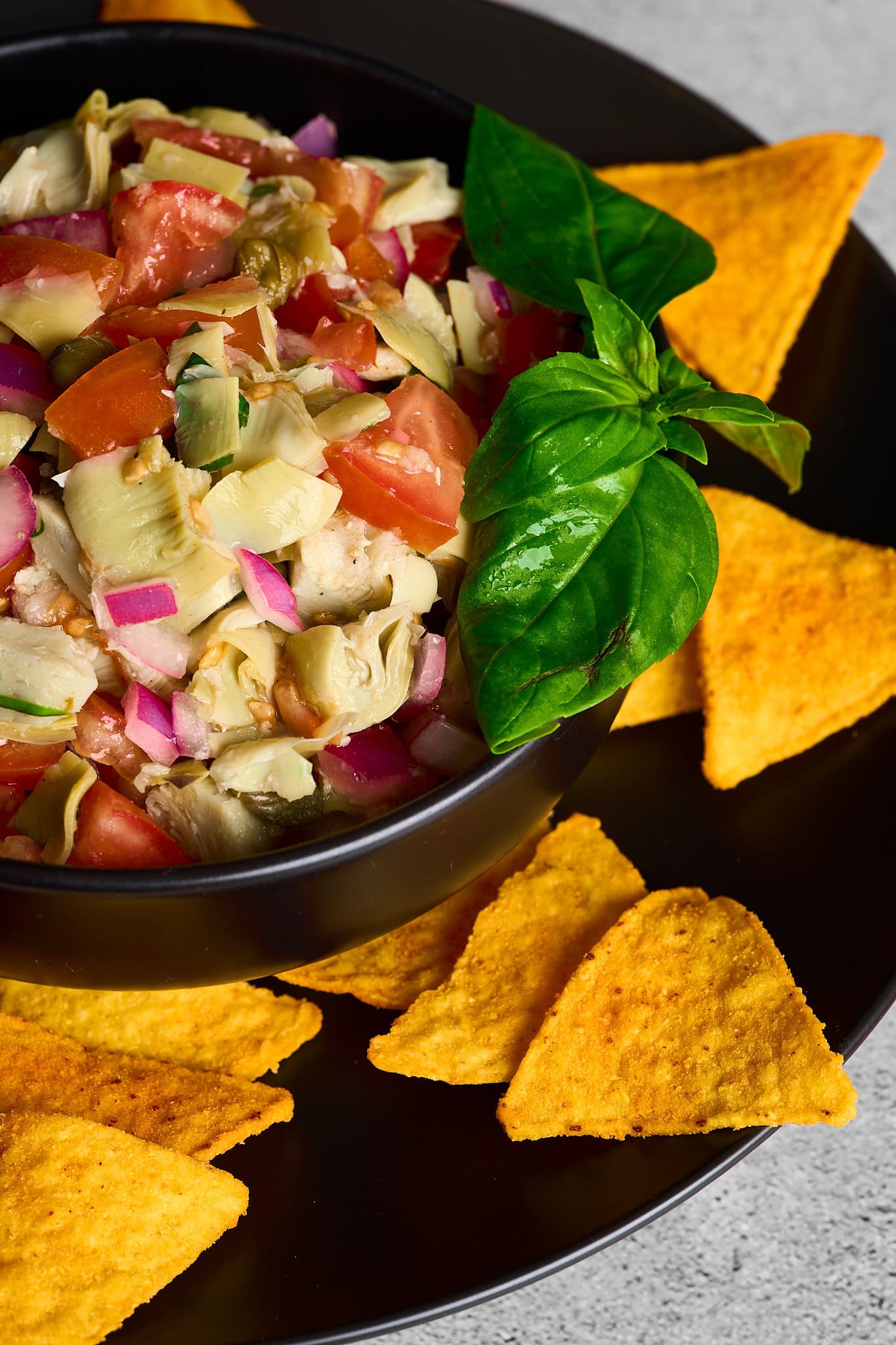 Artichoke salsa is tangy with a slight brininess to it. Not only can it be used as a salsa in which to dip chips, but it can be served as a garnish for fish, chicken or in seafood tacos and all sorts of things.