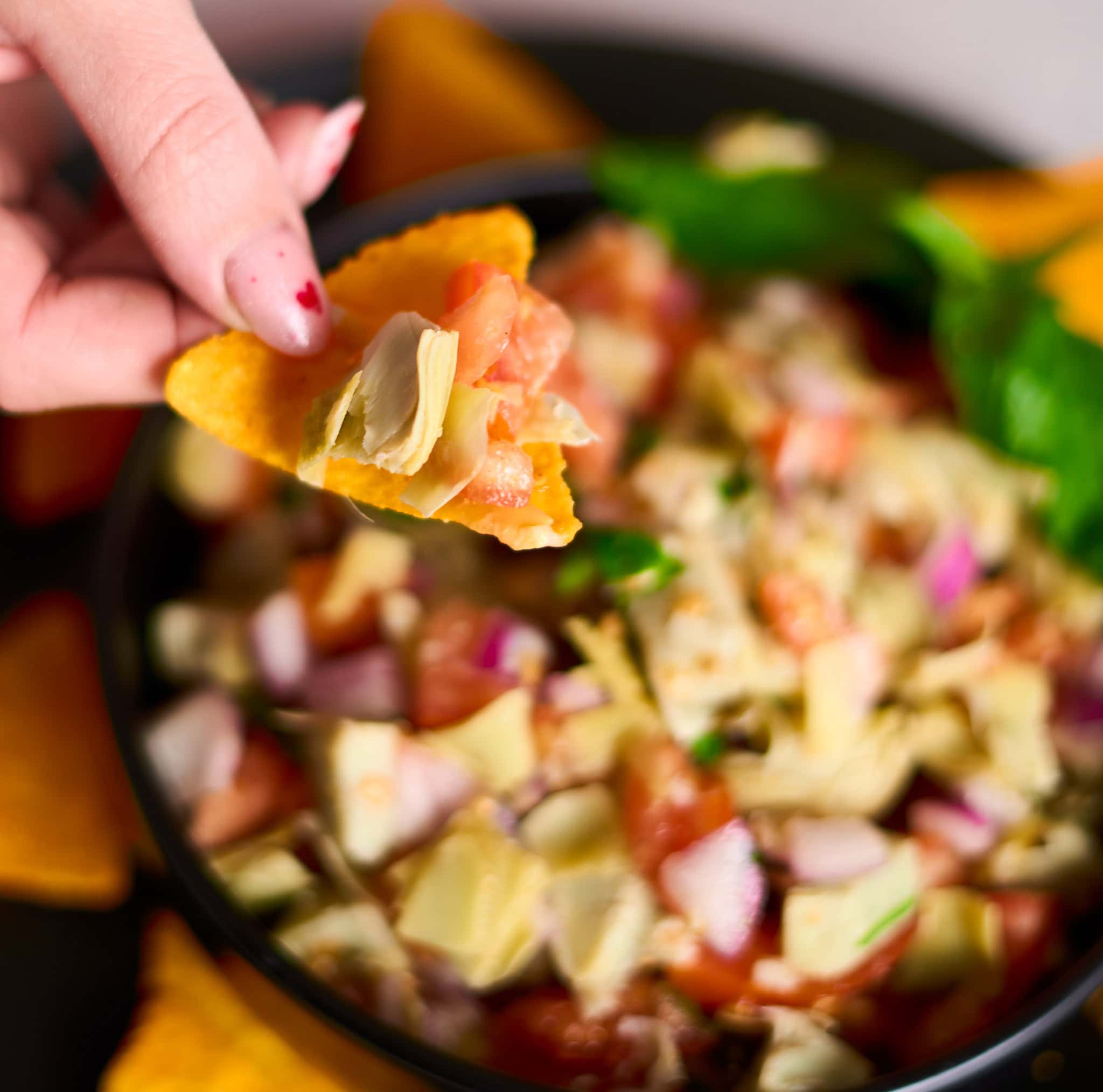 I’m going to be really honest here. When it comes to olives, I’m very particular and, in general, I’m not a fan of olives. They have to be used in very specific and complementary ways in order for me to like them. While most recipes for artichoke salsa call for olives, my recipe does not! I think you are going to like my recipe better, unless you are an olive enthusiast.