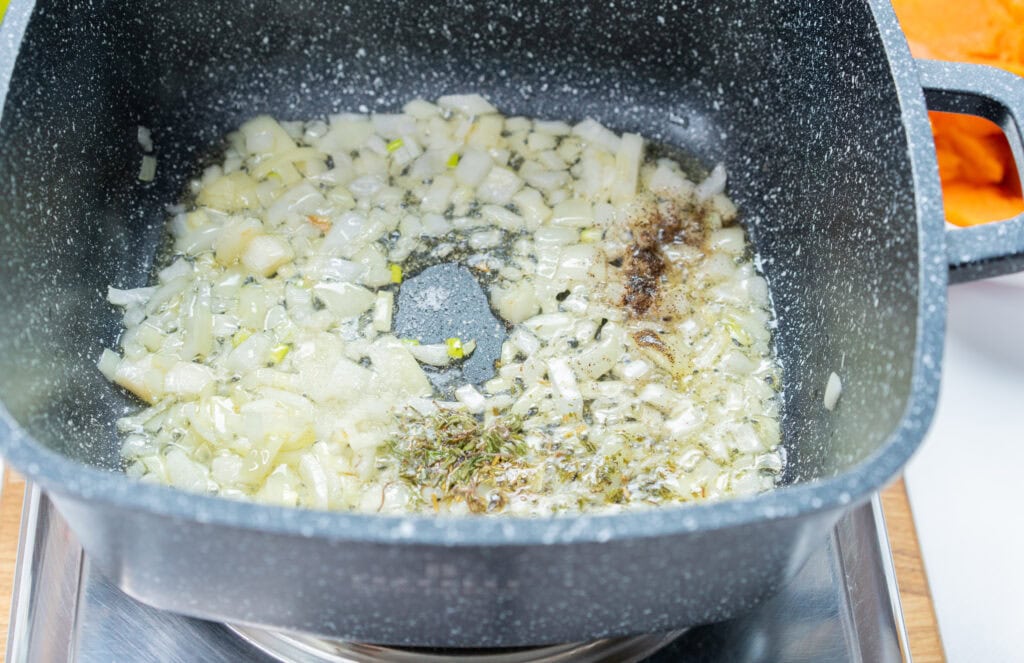 - Heat 2 tablespoons of olive oil in a large stock pot over medium heat then add the diced onions. Sauté the onions for 6-8 minutes until they begin to caramelize and brown.