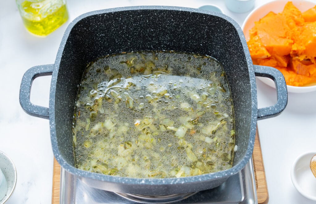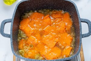 - Once the butternut squash is roasted and fork tender, scoop it out from the skin and add it to the simmering pot and let it cook together for 10 minutes.