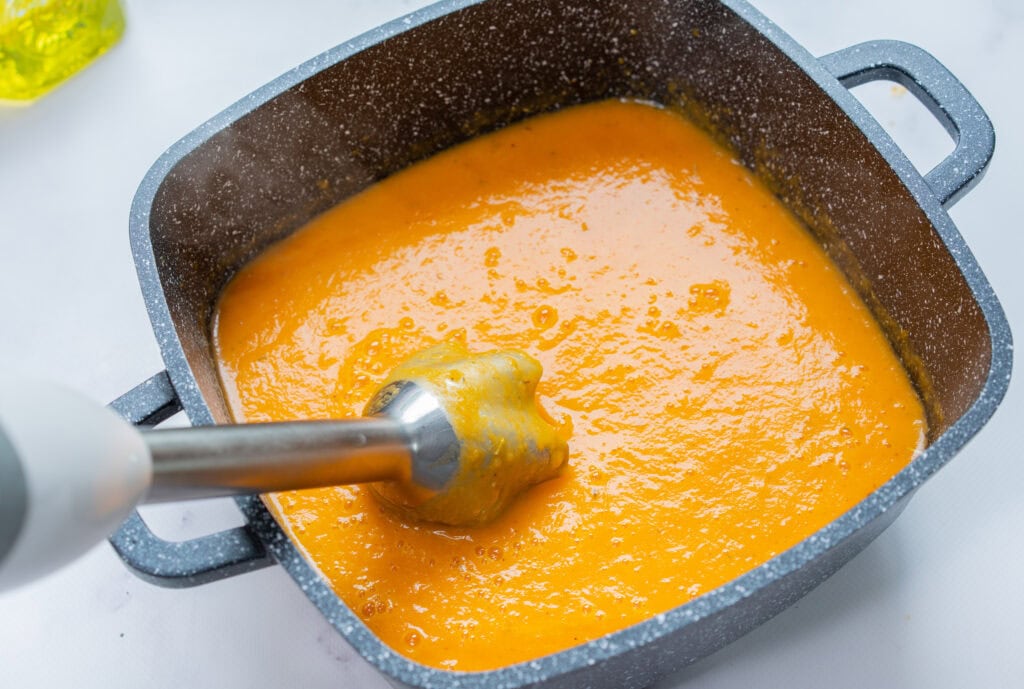 Turn the heat off, and with an immersion blender, blend the soup until it is completely smooth.