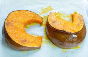 - With a sharp chef’s knife or large knife, carefully cut the butternut squash in half from top to bottom and scoop out the stringy part with the seeds and discard them. Place the squash halves flesh side up in a large baking pan.