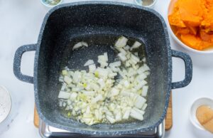 - While the butternut squash roasts, finely dice the onions and mince the garlic.