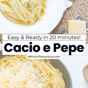 Don’t let the name of this dish throw you off. “Cacio e Pepe” literally means “cheese and pepper”, which is the essence of this cheesy pasta dish.