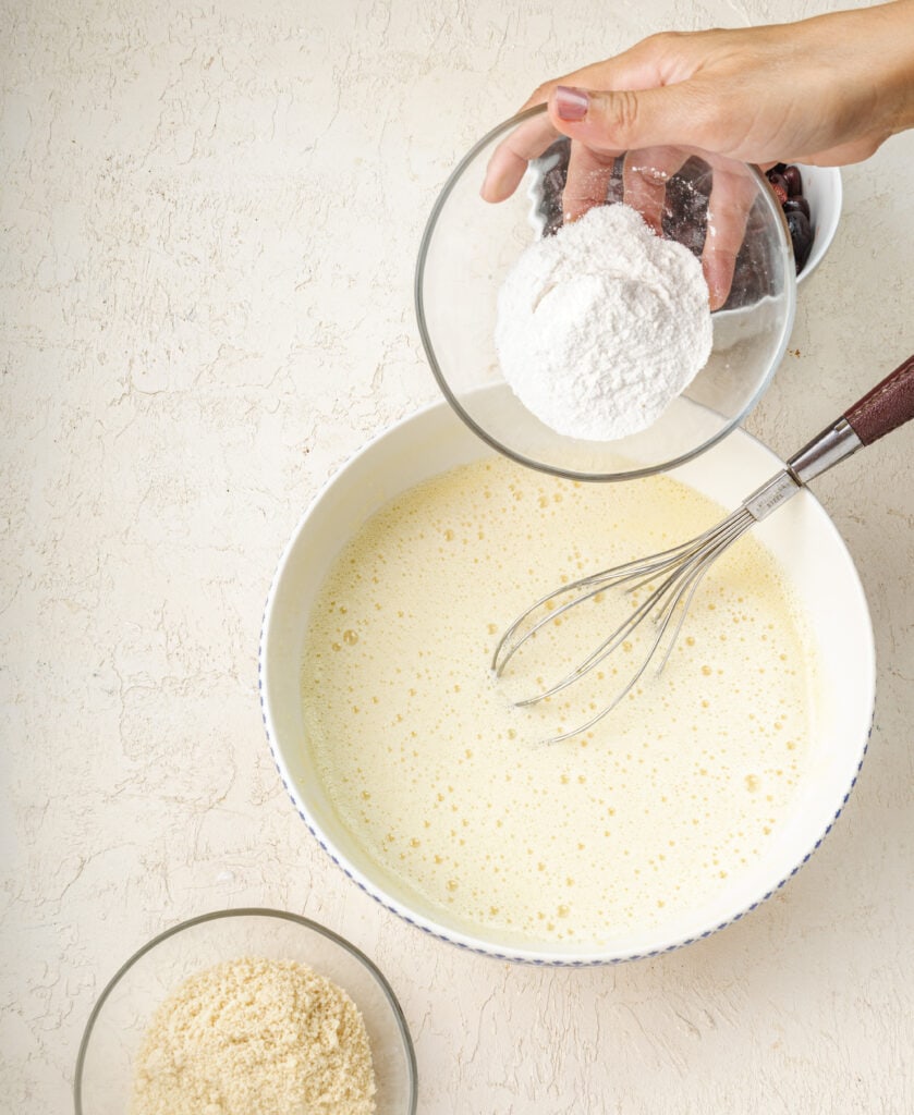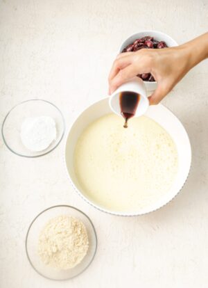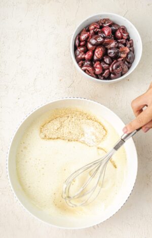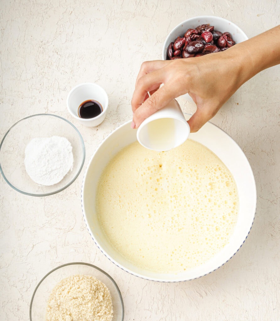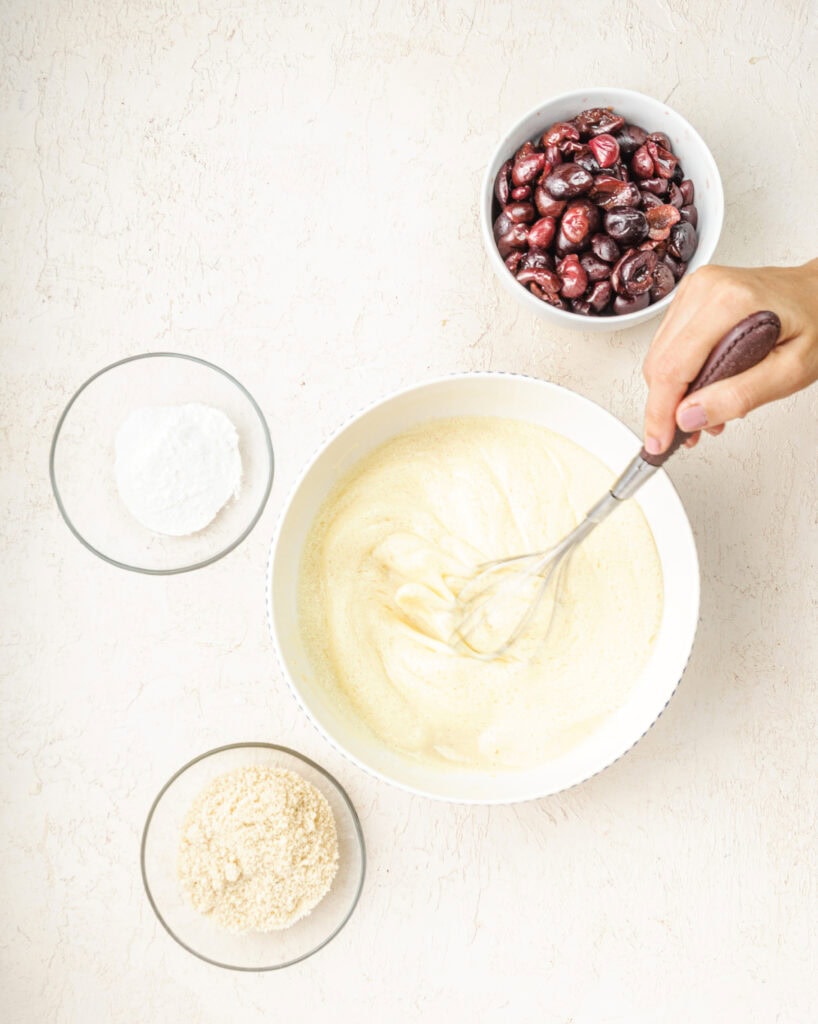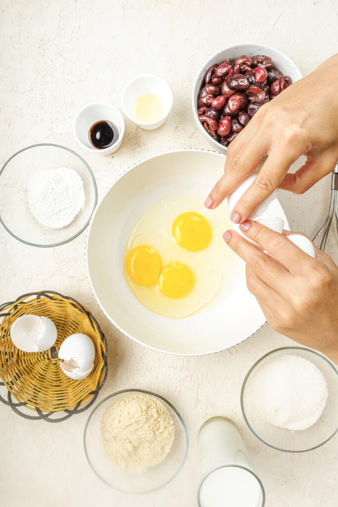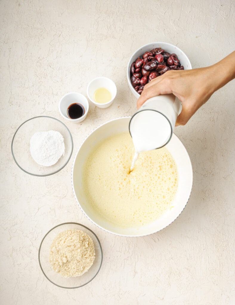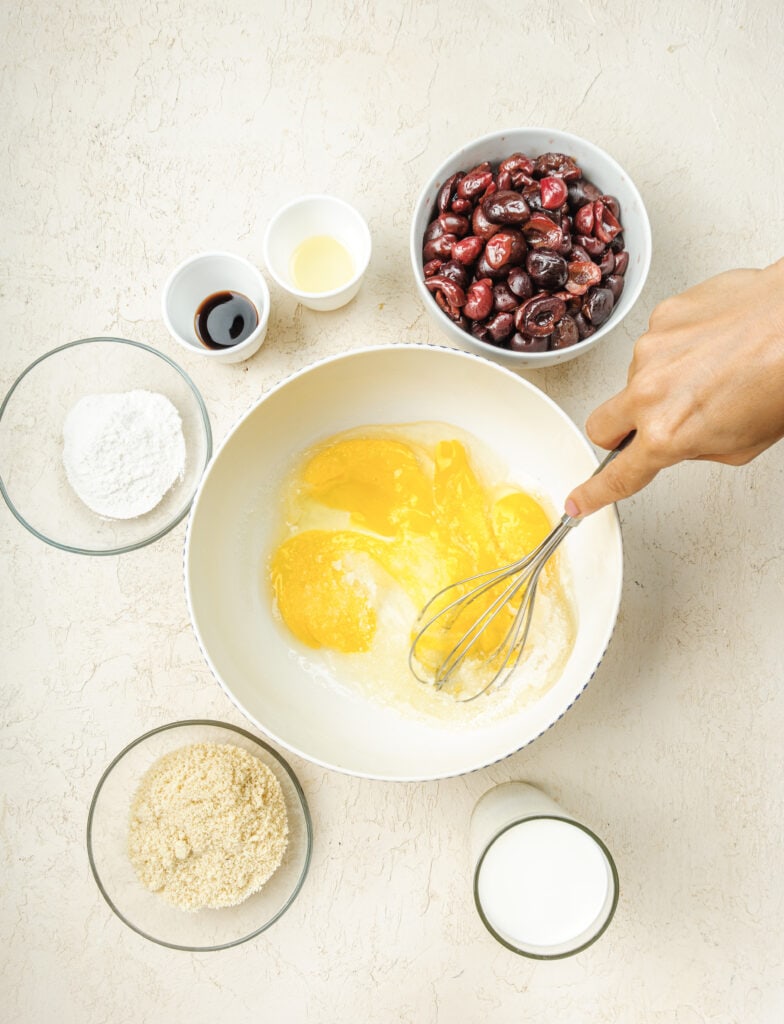 Clafoutis is almost like a custard-based recipe and eggs provide the main structure to it. Since we are making this cherry clafoutis recipe gluten free, we will need to properly substitute the flour.