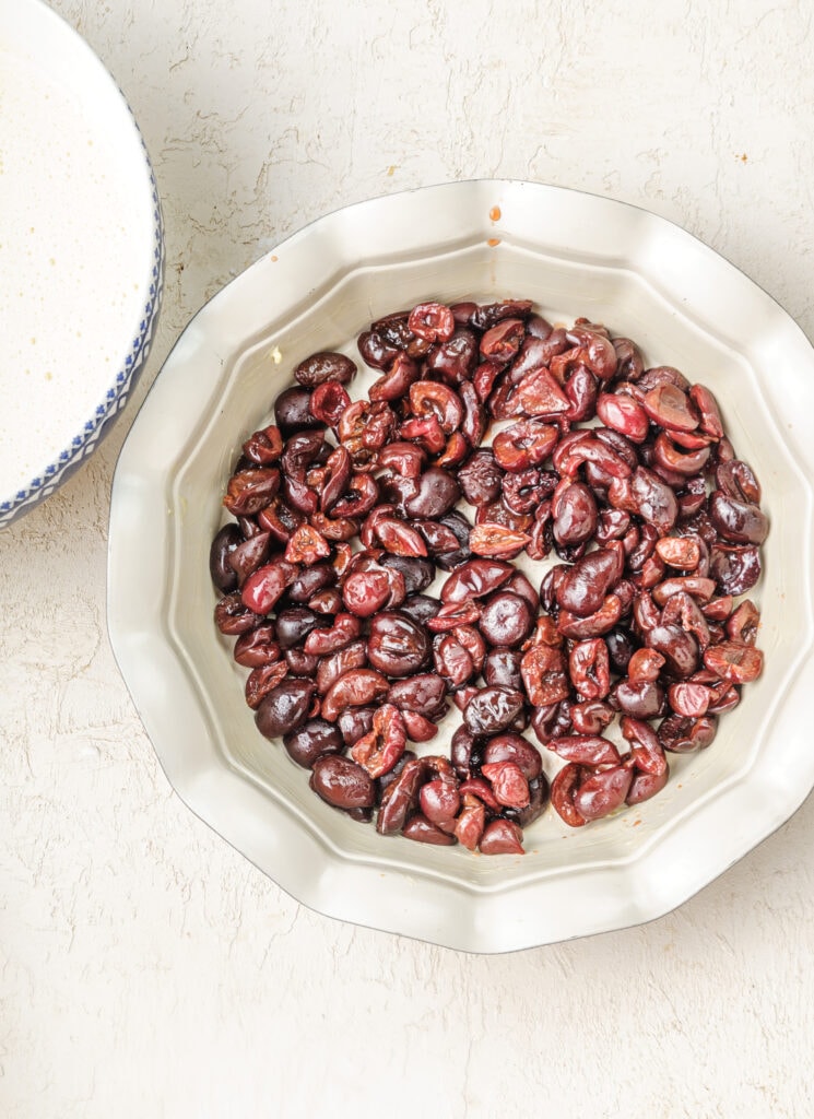 Generously butter a 9-inch pie pan and evenly spread the cherry halves over the bottom of the buttered dish. Pour the batter evenly over the top of the cherries.