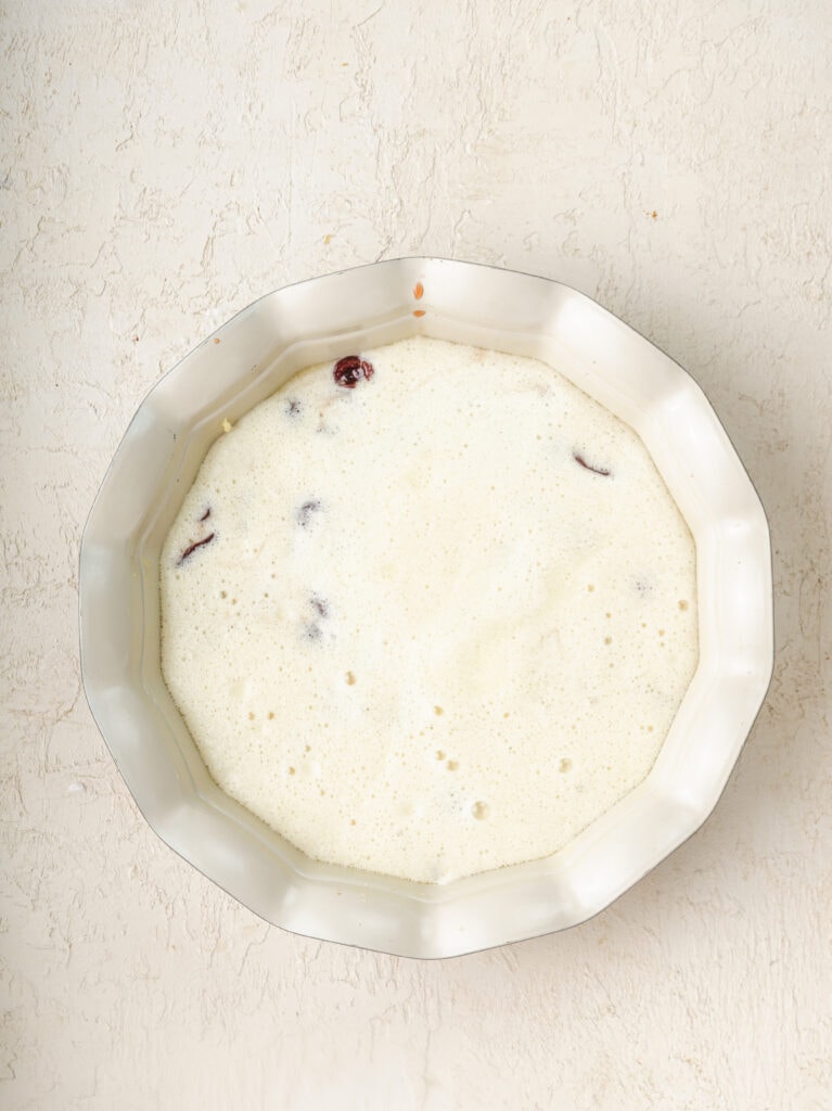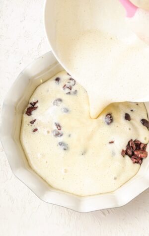 - Pour the clafoutis batter over the top of the cherries and place it in the preheated oven.