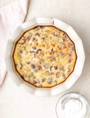 As it bakes, some of the cherries will rise to the top, which adds to the rustic vibe of this clafoutis.