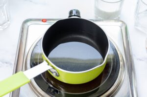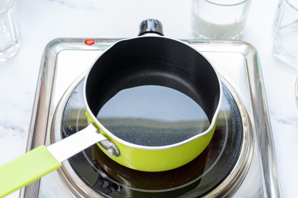 - In a small saucepan, heat the water up until steaming and almost boiling.