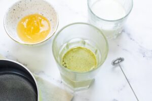- Pour half of the hot water into the mug with the matcha and with a handheld milk frother, mix it together until there are no more matcha clumps and it begins to foam.