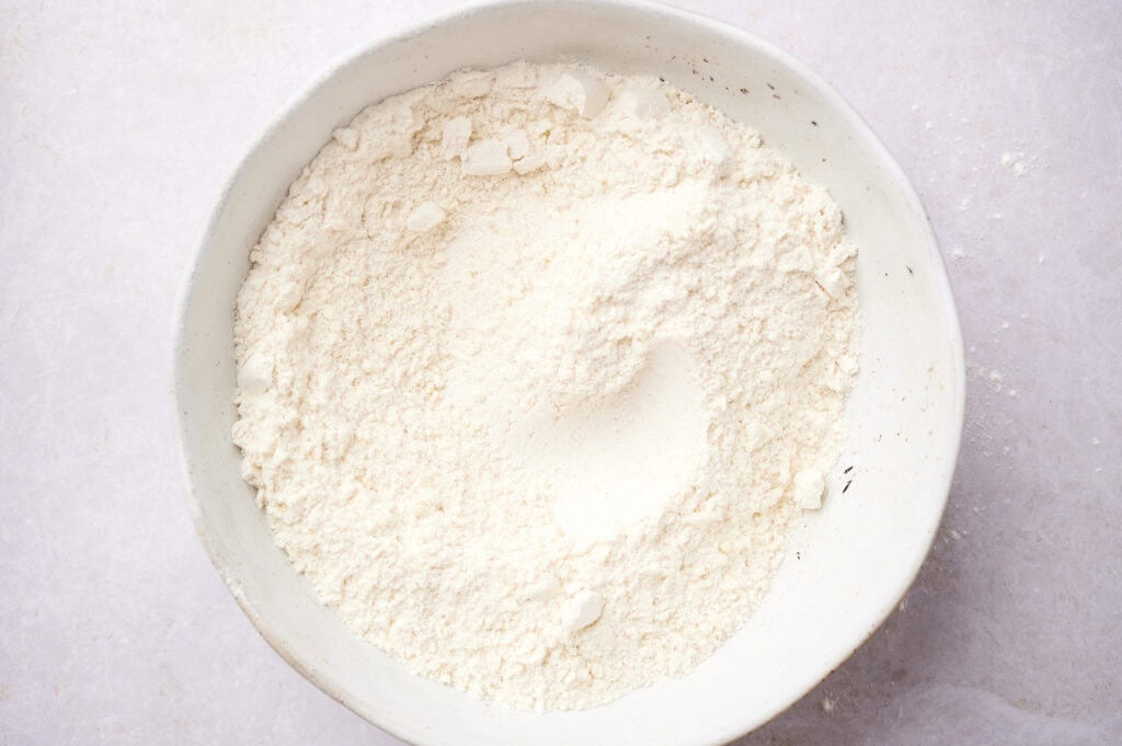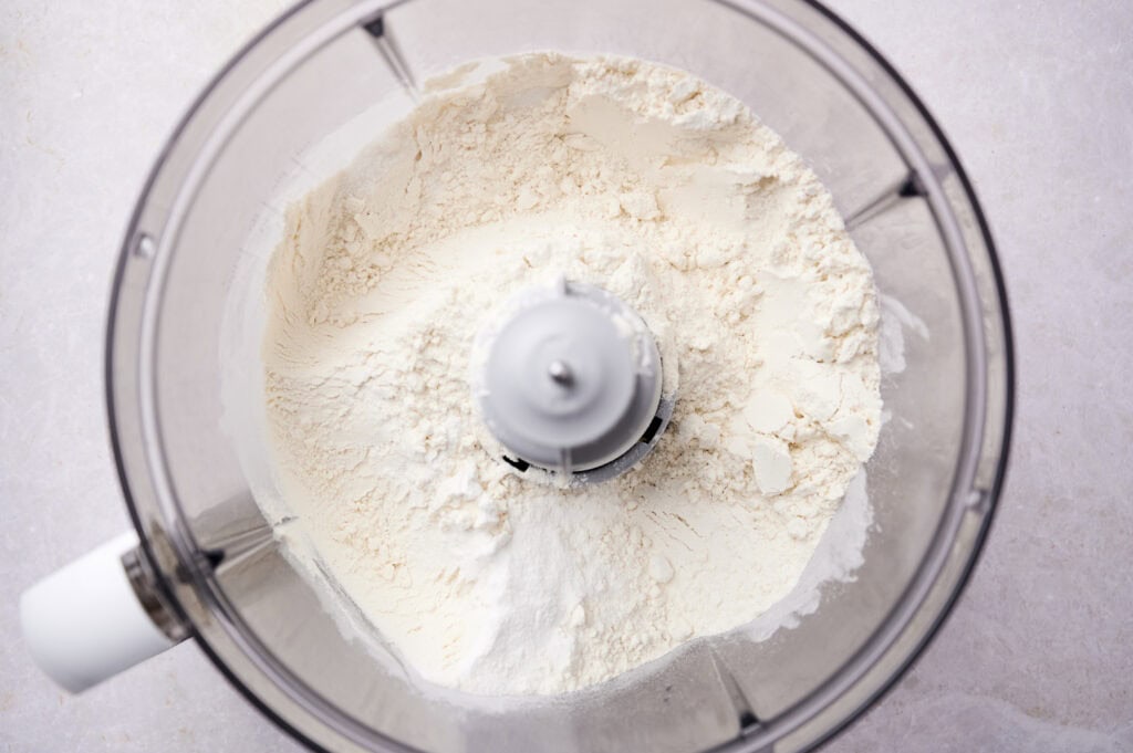Start by adding the flour, baking powder, baking soda, salt and sugar to a food processor. Take your butter straight out of the fridge and quickly cube it or cut it into ½ tablespoons size pieces.