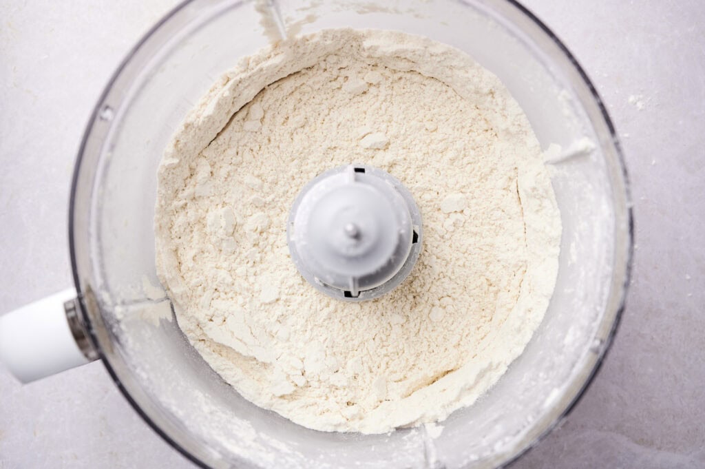 - Cut the cold butter into cubes and add a few cubes at a time into the food processor while pulsing it.