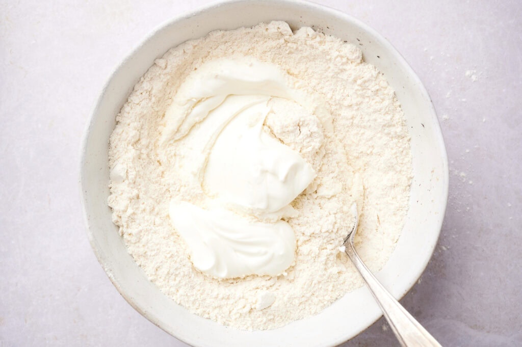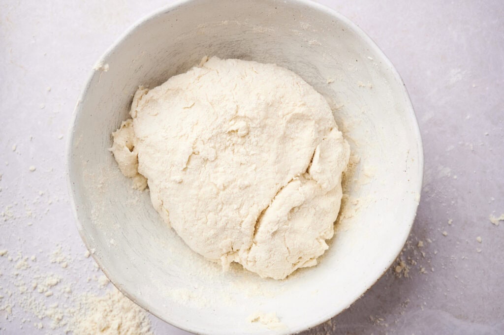 - Pour the butter and flour mixture into a large mixing bowl and fold in the cold buttermilk until just combined. It will be a thick dough. Don’t overwork it.