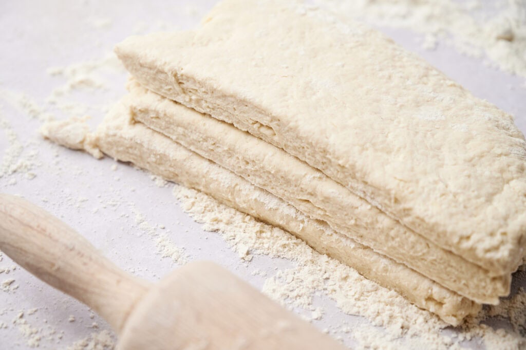 - Cut the dough into thirds and stack the dough pieces on top of each other.