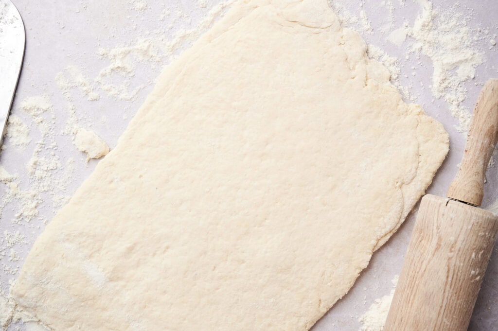 Pour the dough out onto a floured surface and with a rolling pin, roll out the dough into a large rectangle.