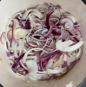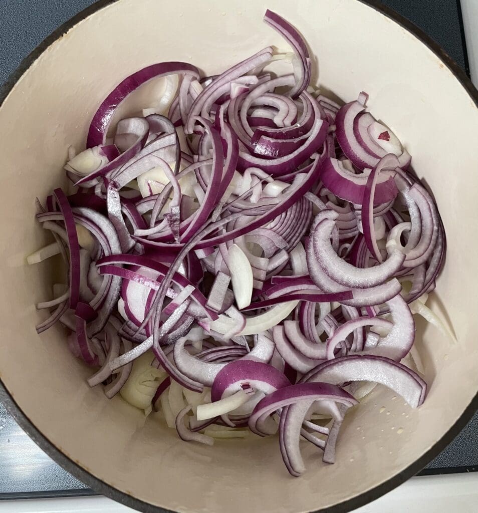 Preparing the onions is the first step to the perfect French onion soup. Over medium heat, add olive oil to a dutch oven or large soup pot. While the oil is heating up, slice the onions into slices. The thickness or thinness is dependent on your preference.