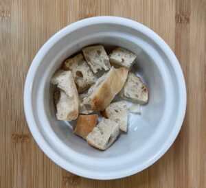 While the soup is finishing simmering, chop the baguette into chunks. If you prefer slices, this is fine too!