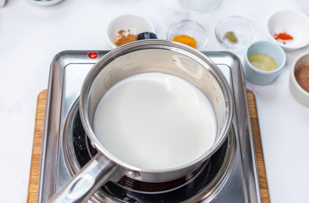 In a small saucepan add your milk of choice. If you want this to be a vegan drink, you can use full fat coconut milk, almond milk or oat milk. I personally like to use whole milk for this recipe. In fact, I have access to raw milk so I like to use that.