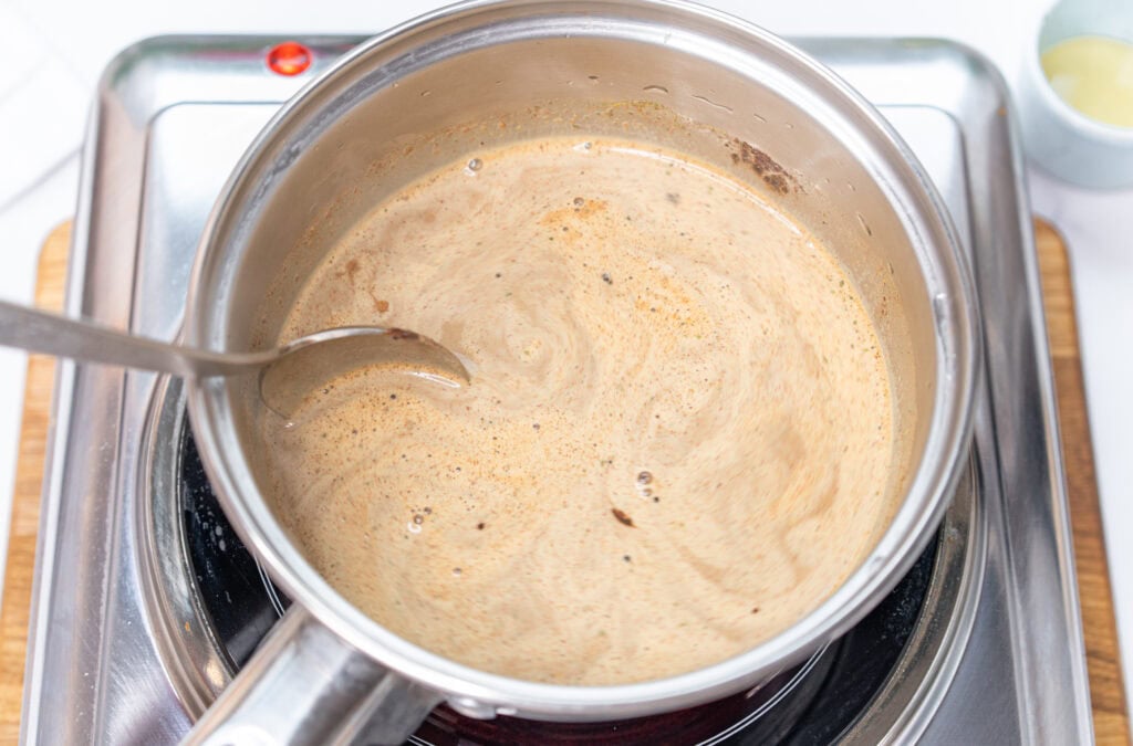 Constantly whisk the milk mixture and spices together while it is heating up. Slowly heat it up until it just begins to bubble on the sides of the pan. Do not boil the milk, otherwise it will separate, and you will end up with burned milk on the bottom of your pan, and a curdled film on top of your milk.