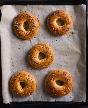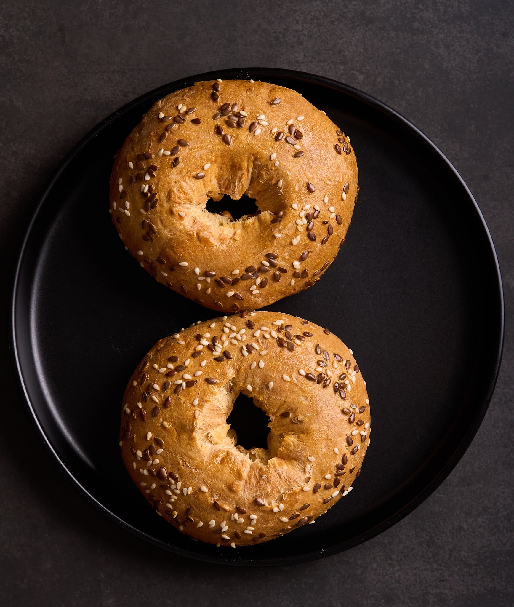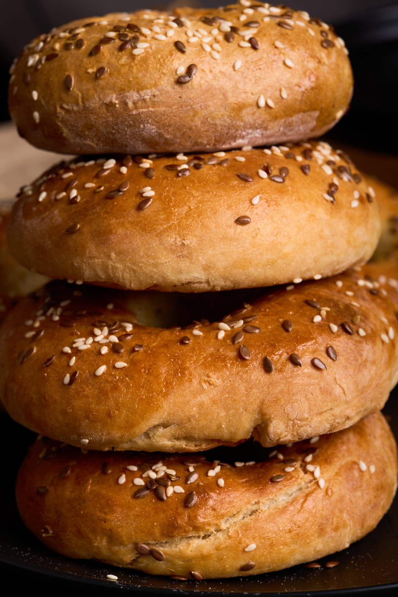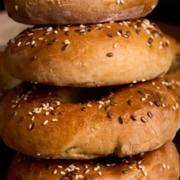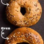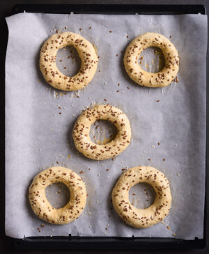 Toppings: Sesame seeds, poppy seeds, everything bagel seasoning. In this recipe I use sesame seeds and organic, brown flax seeds.