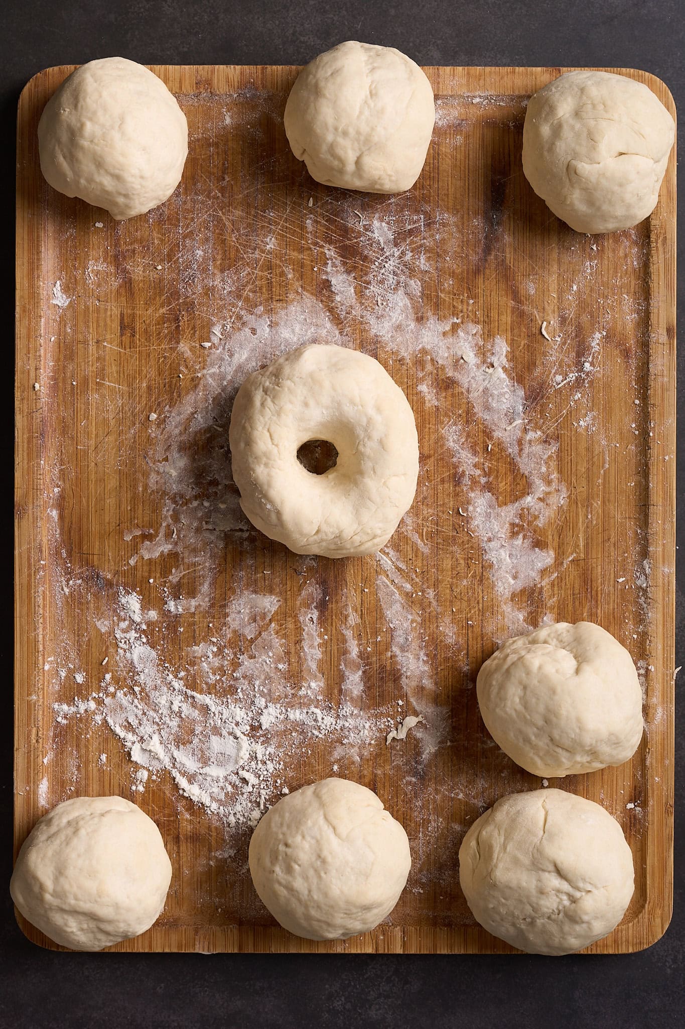 Roll each portion into a ball, then use your thumb to poke a hole in the center. Gently stretch the hole to about 1-1.5 inches wide (it will shrink during baking).
