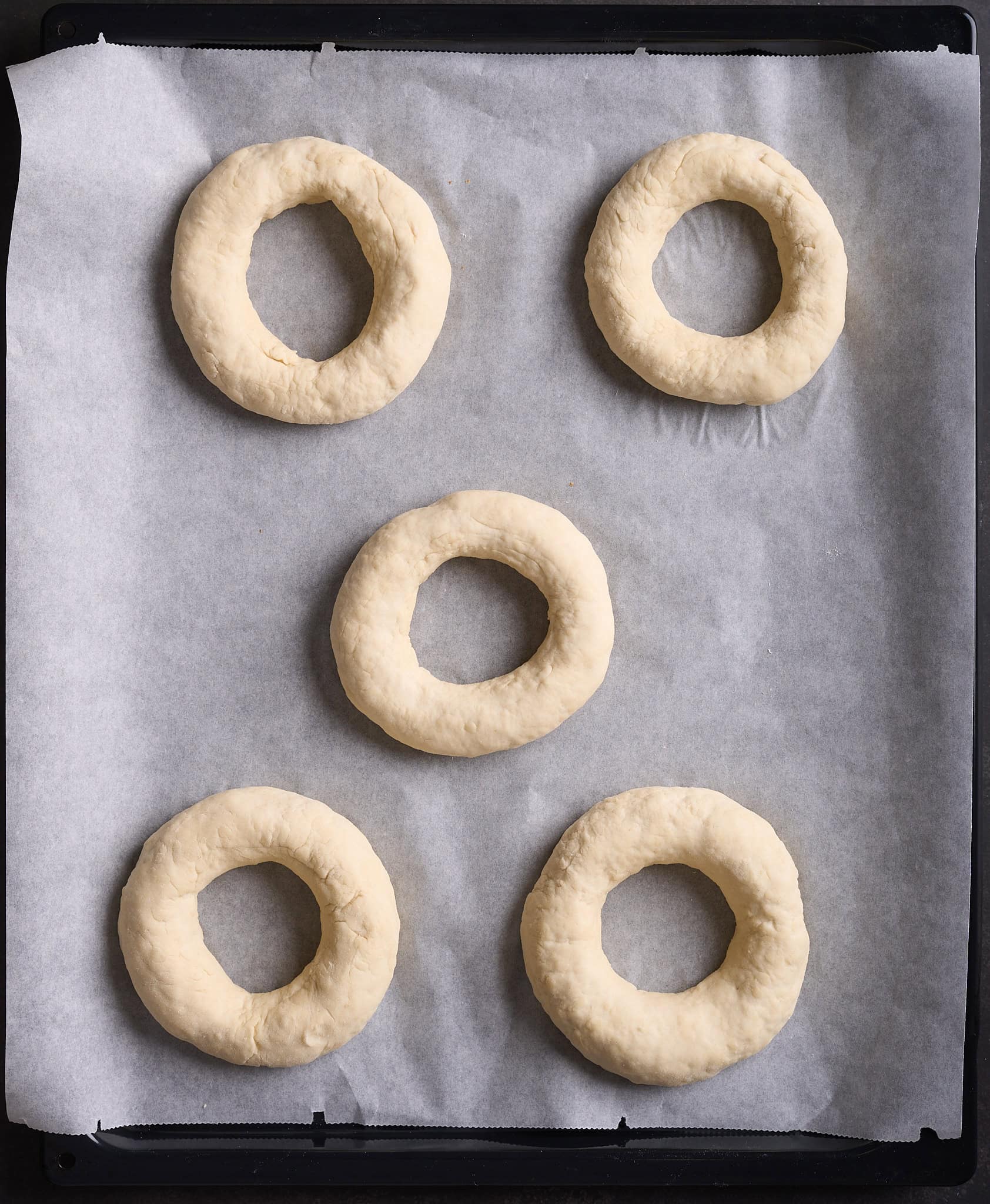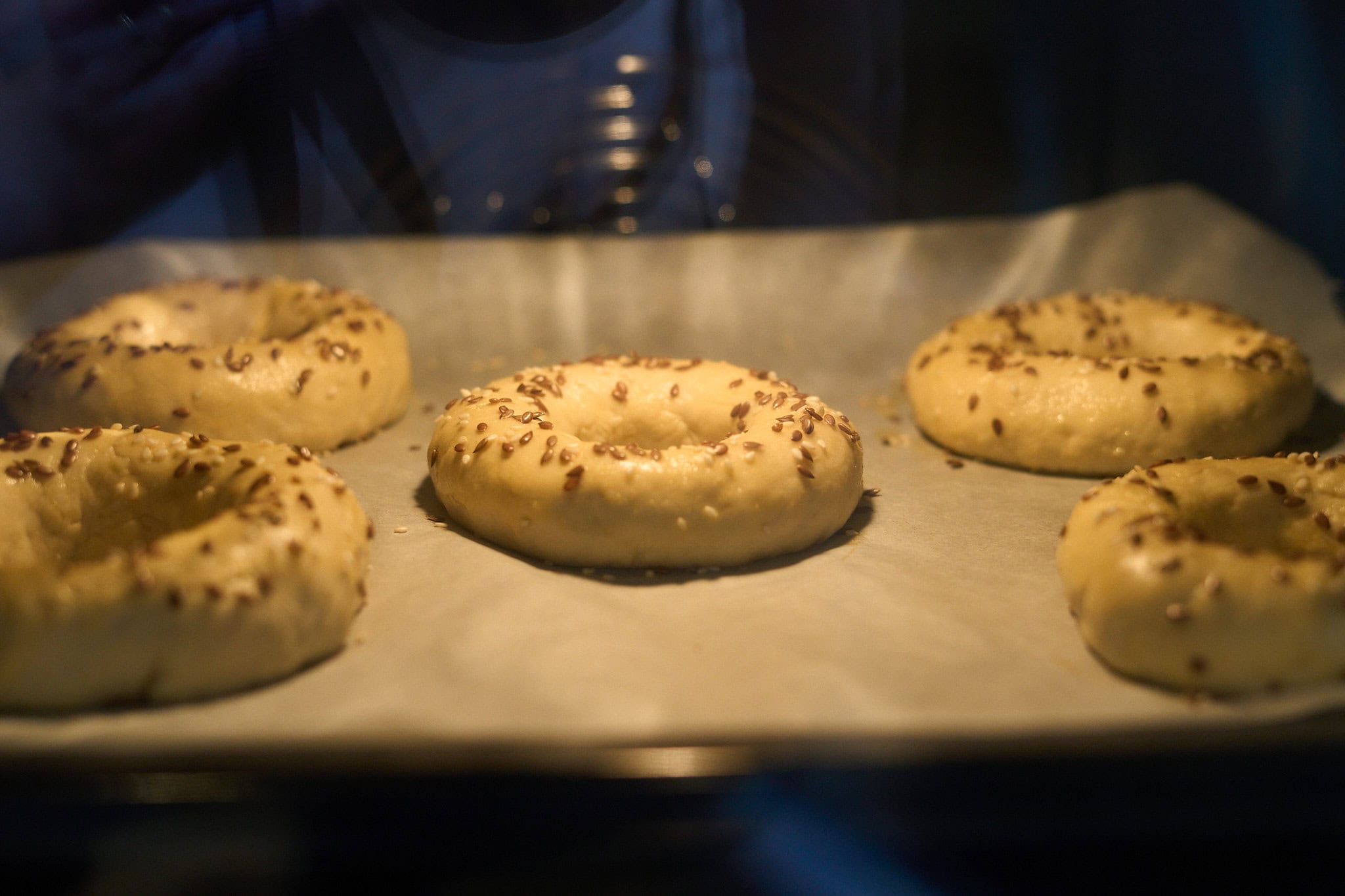 - Place shaped bagels on a parchment-lined baking sheet and freeze until solid (about 2 hours).Make sure they don’t touch each other.