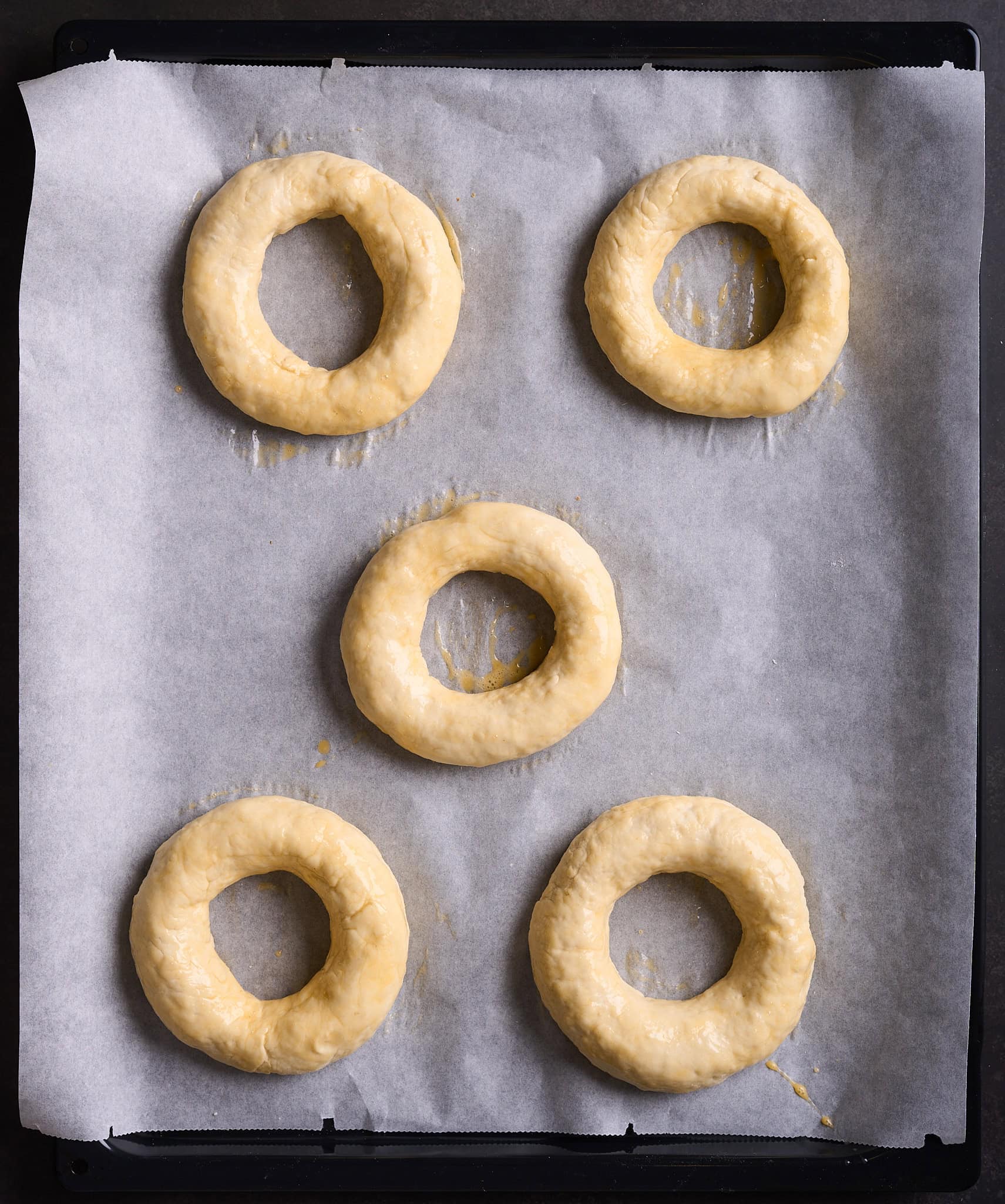 - When ready to bake, place frozen bagels on a parchment-lined baking sheet.
