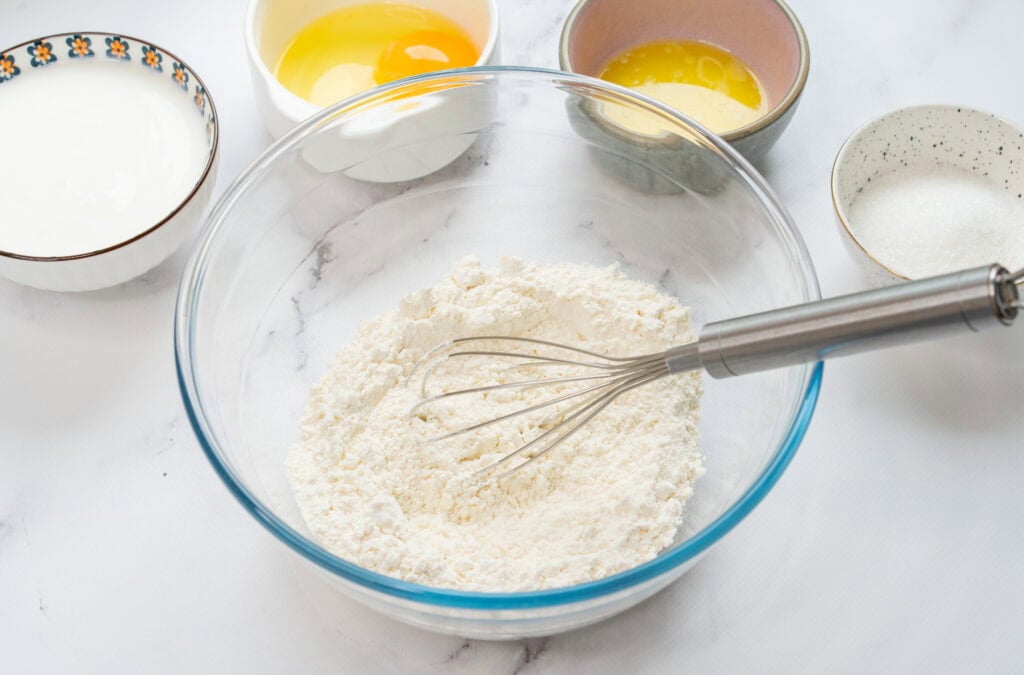 - Sift the flour, sugar, baking powder, baking soda and salt into a large mixing bowl.