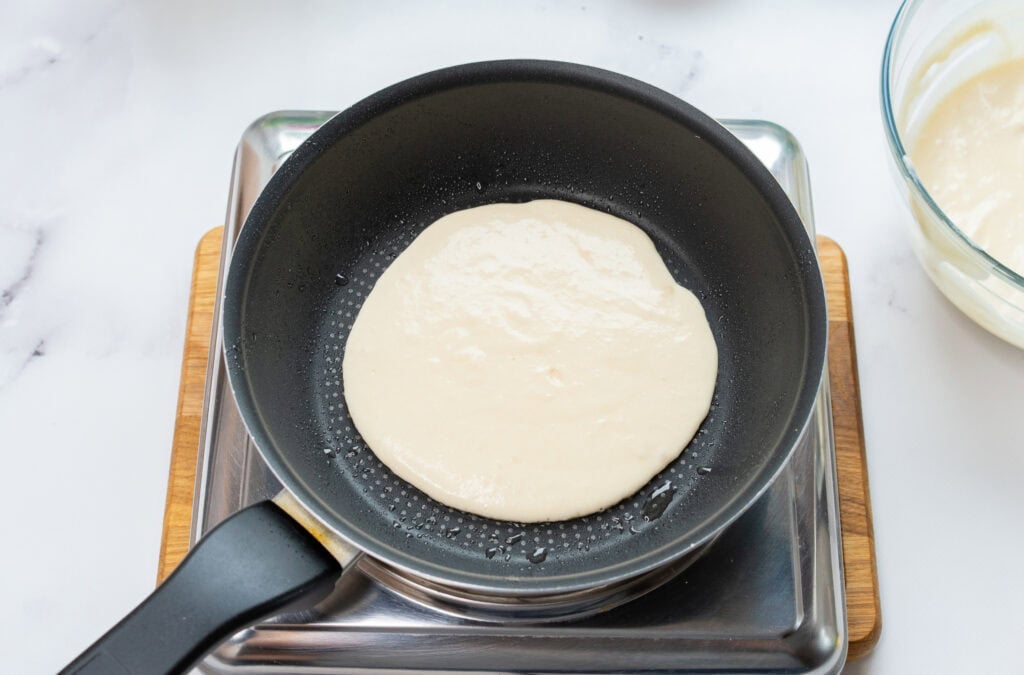 - As soon as the butter begins to sizzle, ladle some of the batter into the pan. The batter will spread out, you should aim for making your griddle cakes to be about 5 inches in diameter.