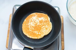 When the bubbles in the center of the griddle cakes begin to pop and to leave a hole, then you know they are ready to be flipped. Once that happens you can flip your griddle cakes with a large spatula.
