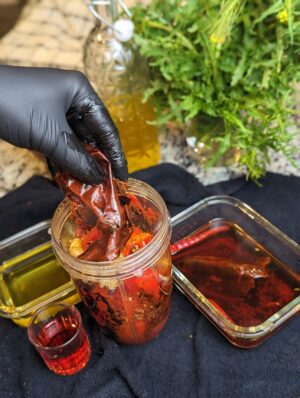 - In a small container, soak dried chilies in hot water for 10 minutes to rehydrate.