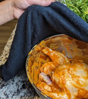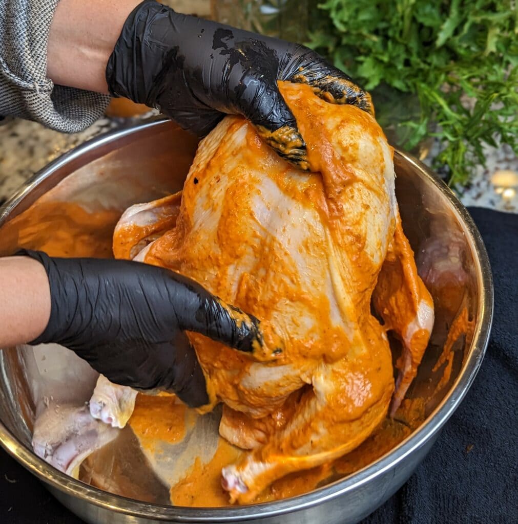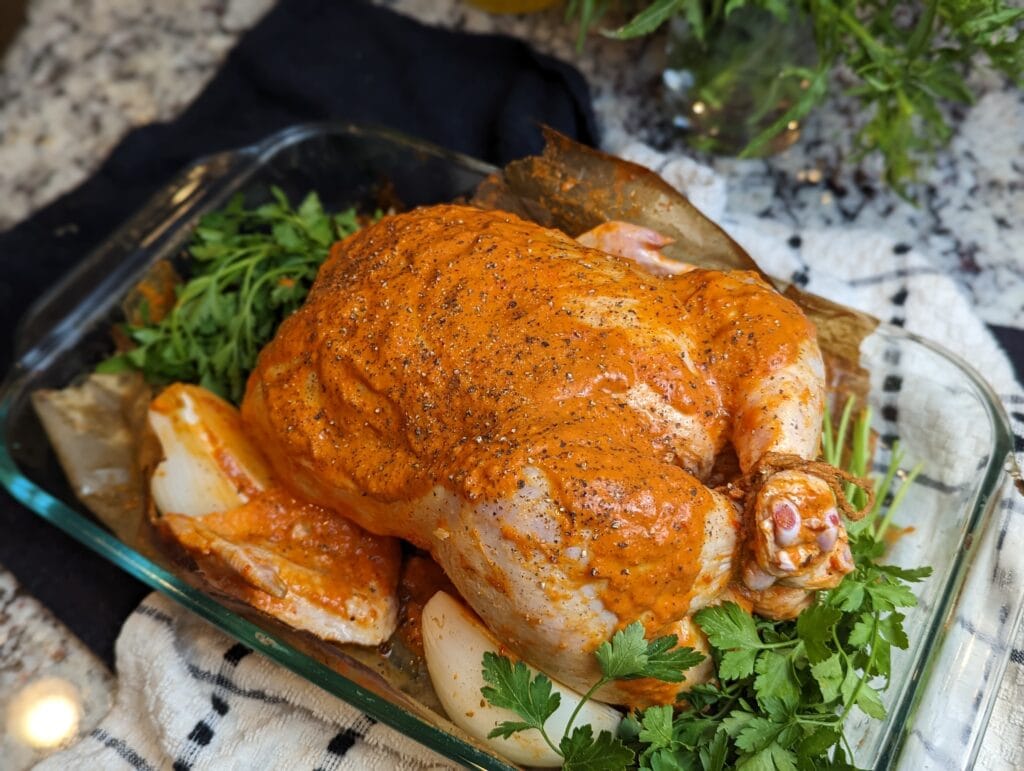 - Place the chicken in a big bowl and pour the harissa over the chicken, covering the entire chicken.