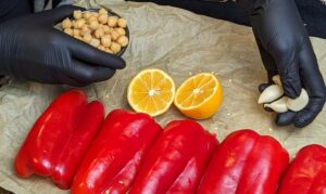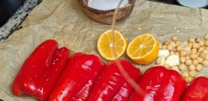 - Half and deseed bell peppers and cut the lemon in half.