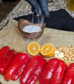 - Add bell peppers, lemon, garlic cloves, and chickpeas to a parchment-lined baking tray.