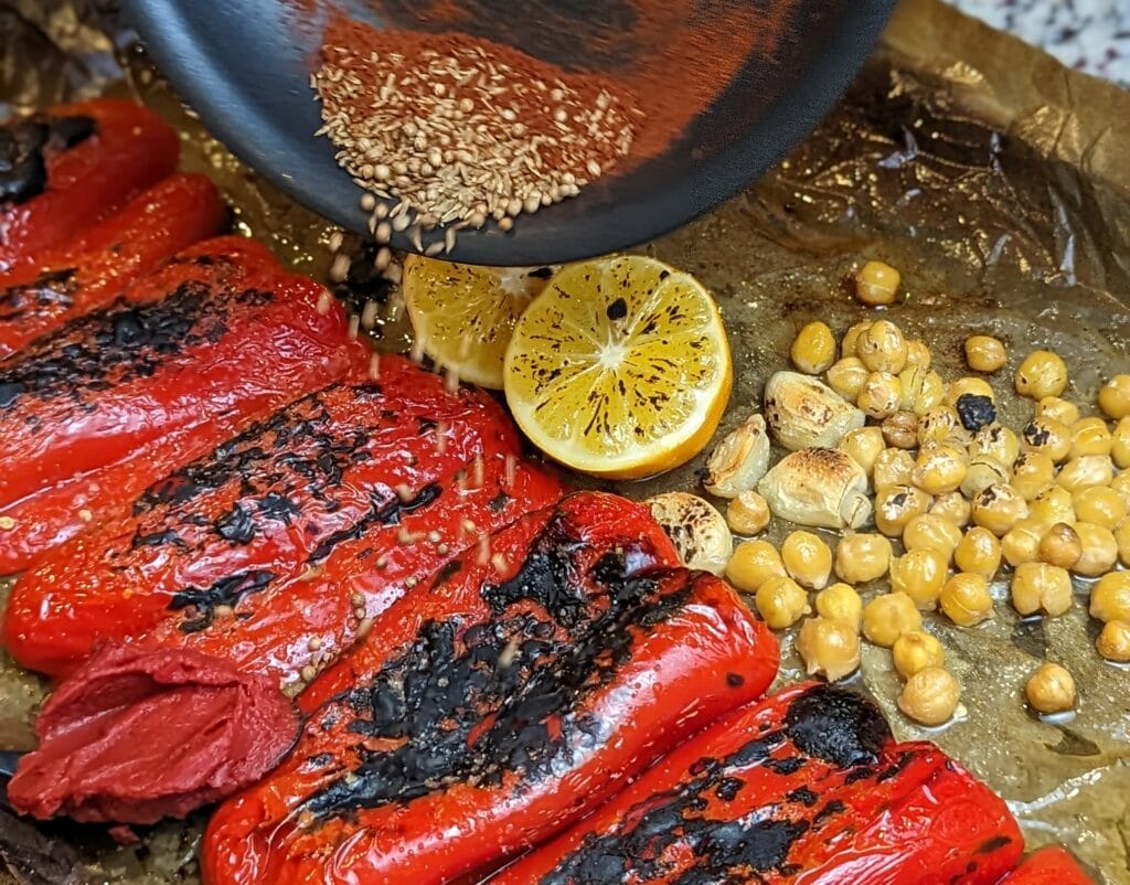 - Sprinkle toasted seasonings on top of the roasted peppers and chickpeas.