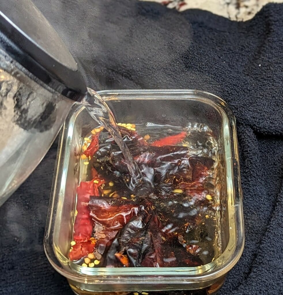 Now, let's prepare our dried chilis! Place them in a small, heat-resistant container and pour boiling hot water over them. Allow the chilis to rehydrate for at least 10 minutes.