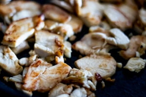 - In the same pan, add 1 tablespoon of oil and add your bite-size chicken pieces. Cook for 4-5min, until heated through and lightly browned. Remove from pan and set aside.