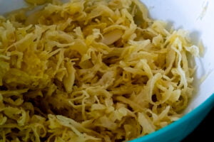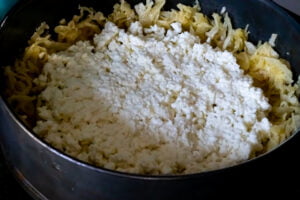 - Pour the melted ghee over the shredded pastry in a large bowl. Using your fingers, rub it into the pastry until it's evenly distributed.