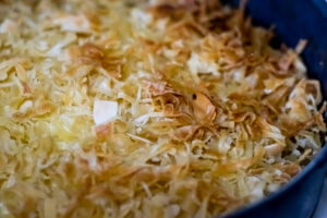 - Top off your masterpiece with the remaining Konafa pastry. Sprinkle it evenly to cover the filling and press gently to smooth it out.