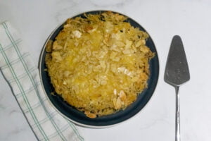 - Immediately after removing the cake from the oven, while it's still piping hot, pour your cooled syrup all over the Konafa. Give it about 10 minutes to soak up the syrup before flipping it onto a serving plate.