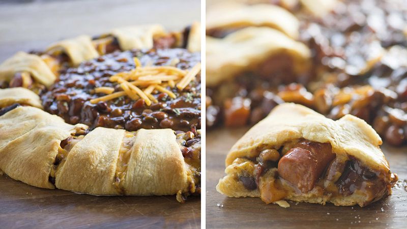 Simply roll your leftover hot dogs with cheese in crescent dough, partially bake them, then nestle them in canned chili for the final bake. Finish with a garlic butter brush for extra flavor.