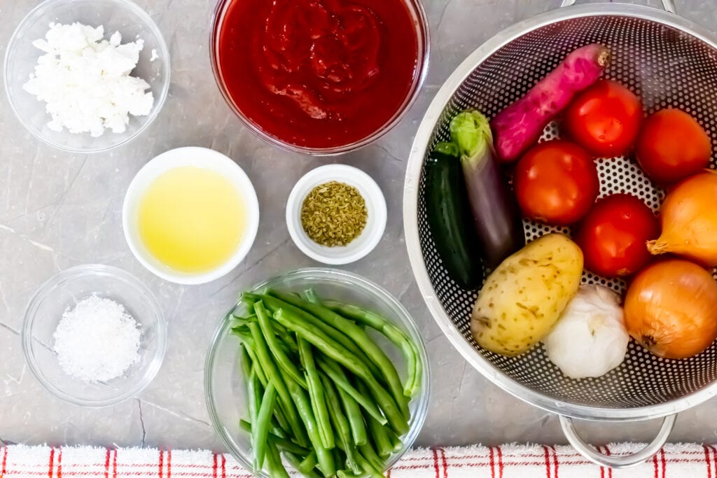 - Continue layering the eggplant, zucchini, onions, garlic, tomatoes, and green beans separately in the dish, seasoning each layer with salt and drizzling with olive oil as you go. If using optional vegetables, include them in the layers as desired.