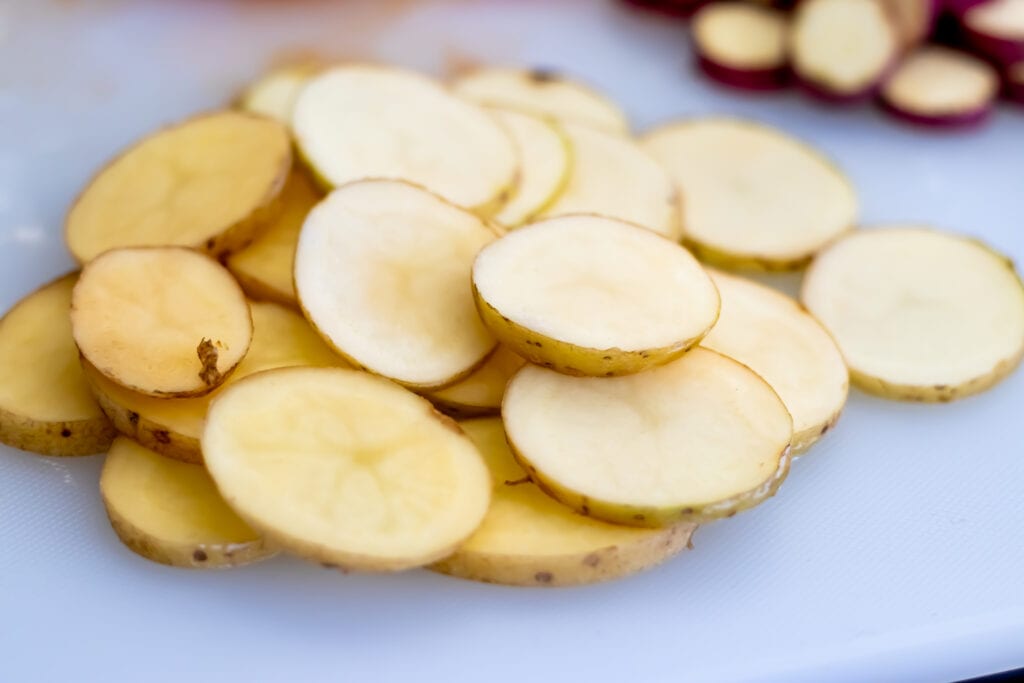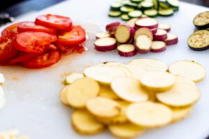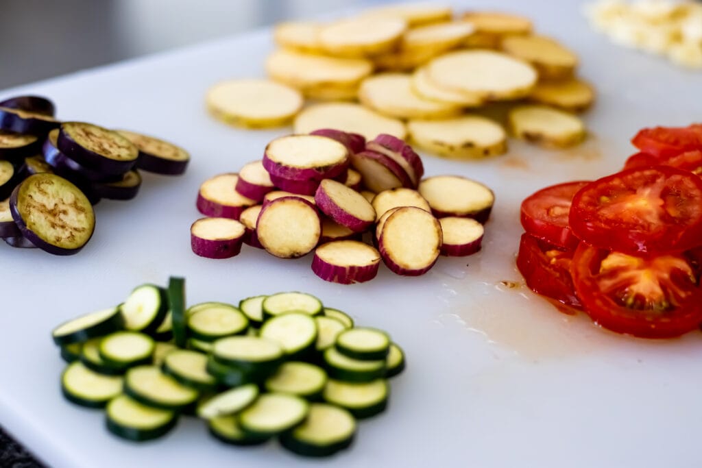 - Clean and cut the russet potato, sweet potato, eggplant, zucchini, and tomatoes into uniform slices, about ½ inch thick. Halve or quarter larger slices. You can keep the skin on for extra nutrients and texture or remove it if you prefer.
