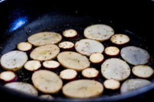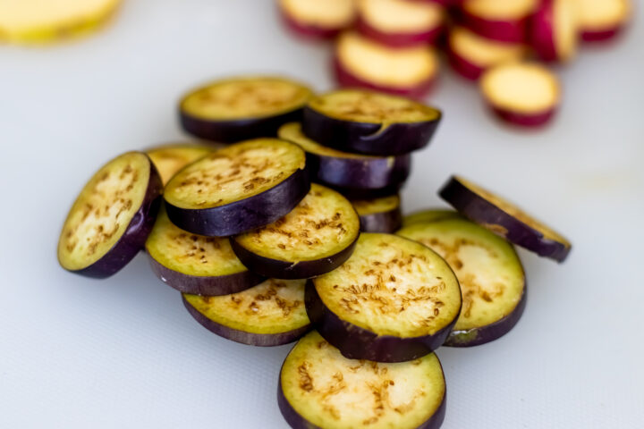 Some people remove the skin of the eggplant, but it adds vibrant color to the dish and is packed with important nutrients.