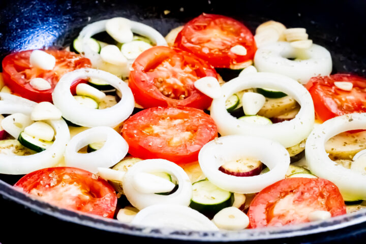 The delightful duo; eggplant and zucchini. These are vegetable friends and can be added simultaneously to the bake.
