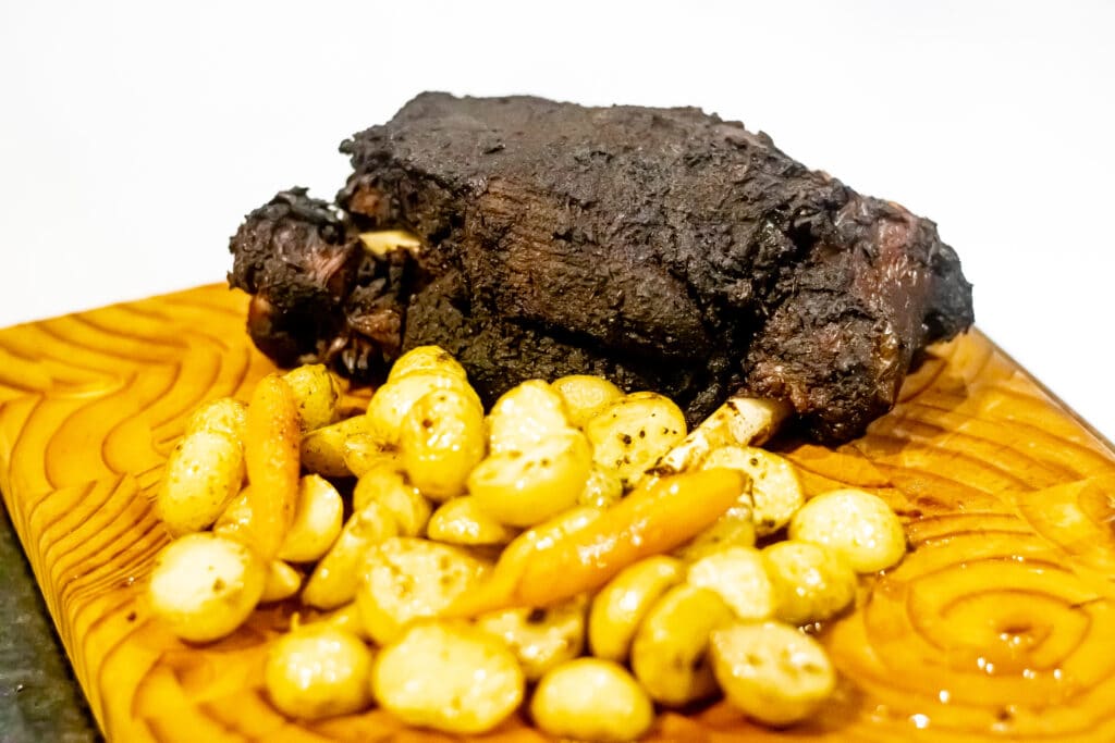 - The lamb is ready when it's fork-tender and you can easily shred it off the bone. This usually happens around the 6-hour mark.