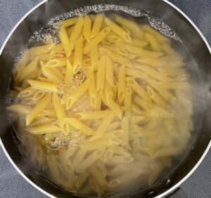 - Boil penne pasta per the directions on the packaging, once cooked, set aside.
