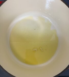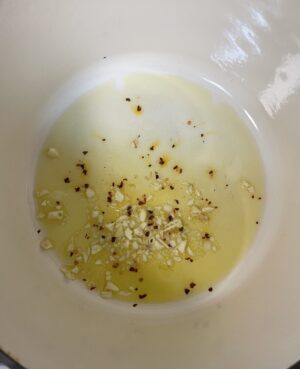 Next, heat up a large saucepan to medium heat. Add in the olive oil and get that nice and hot. Once the olive oil is hot, add the minced (or chopped) garlic and red pepper flakes.