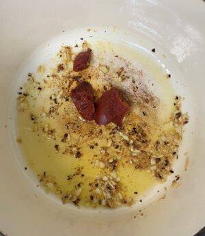 Once the garlic begins to brown, stir in the tomato paste and combine until the mixture is cohesive.